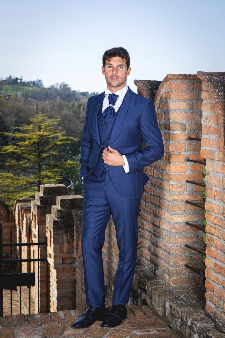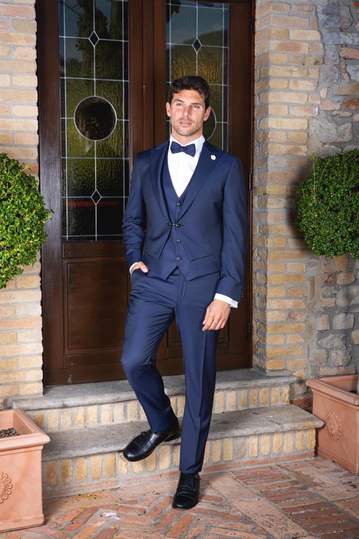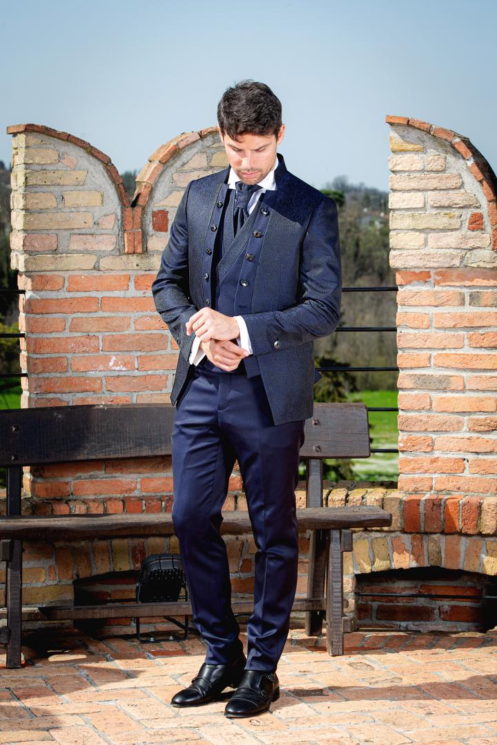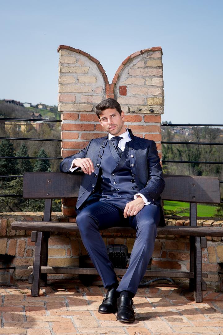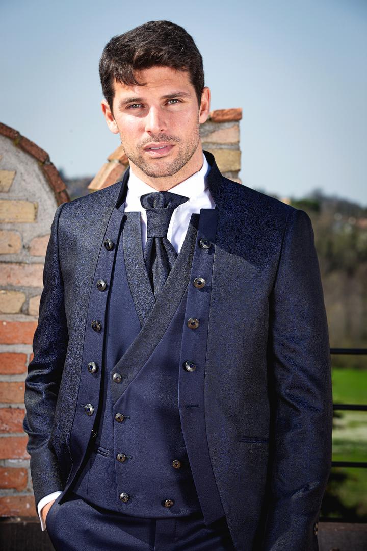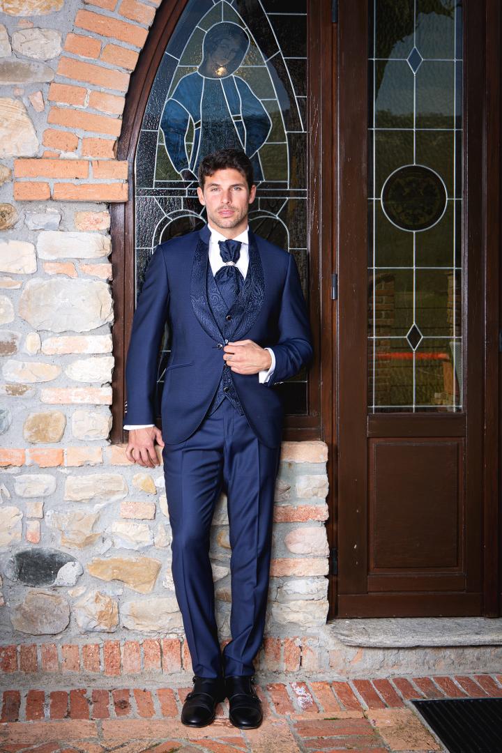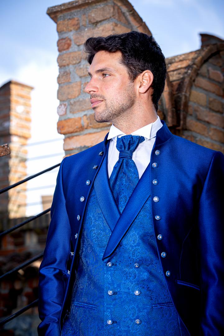Abiti per lo sposo più esigente. Colori che vanno dal blu scuro al blu chiaro attraversando sfumature uniche nel loro genere. Abiti sposo impreziositi da finiture sartoriali e bottoni gioiello Swarovski. I revere possono essere a lancia oppure il collo della giacca può essere a scialle ma con un contrasto sul colore di base.