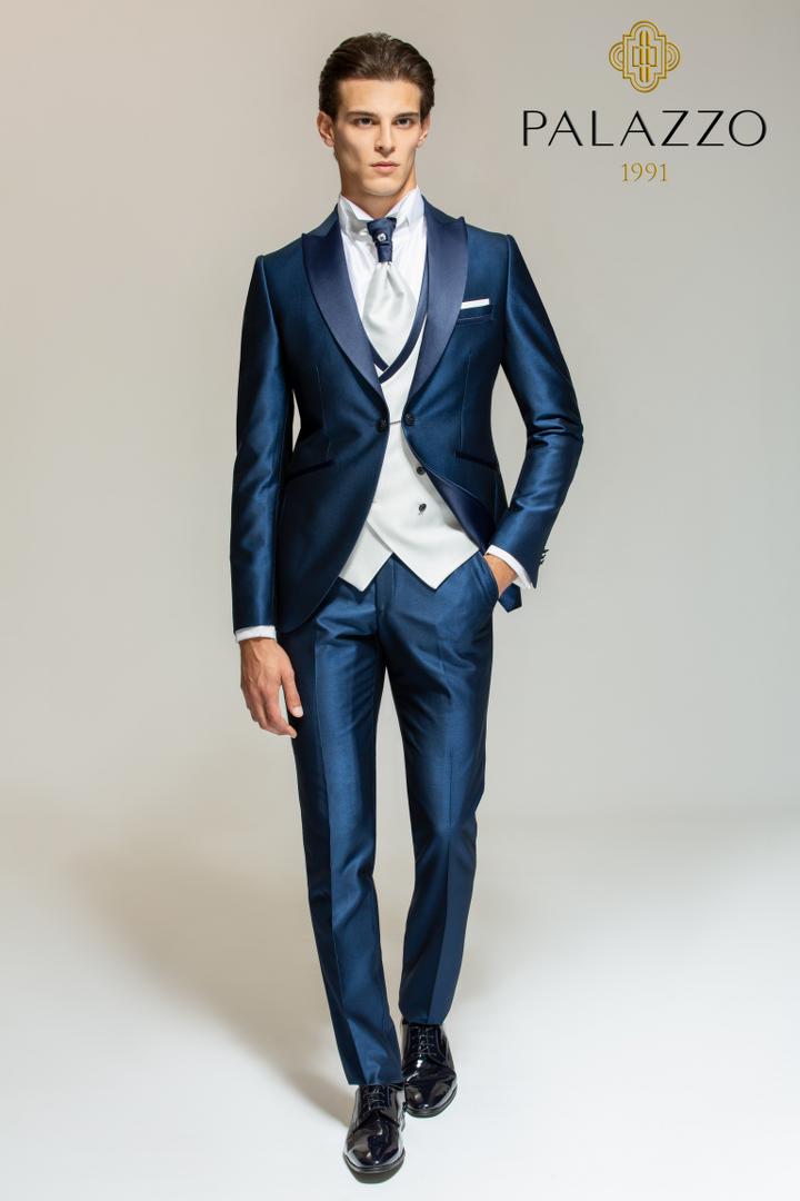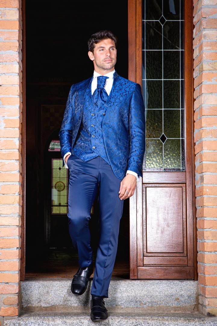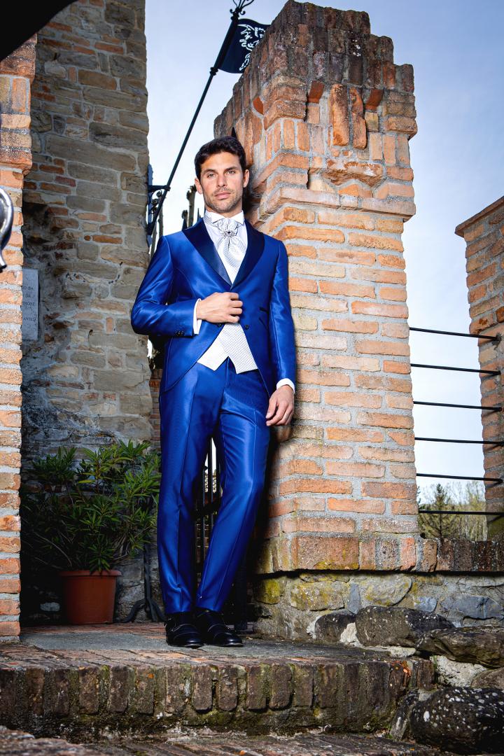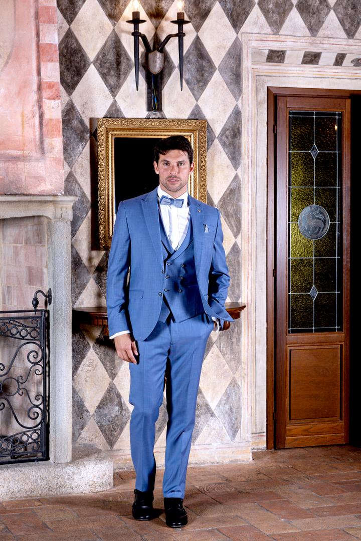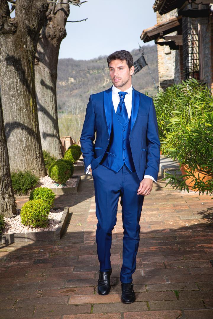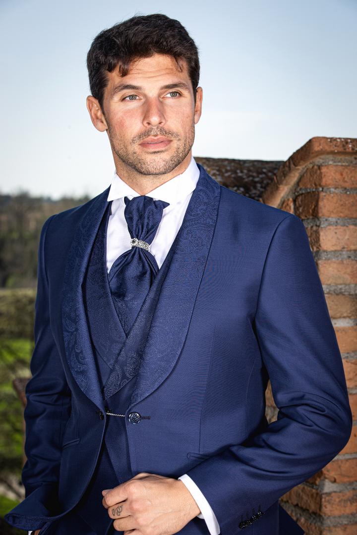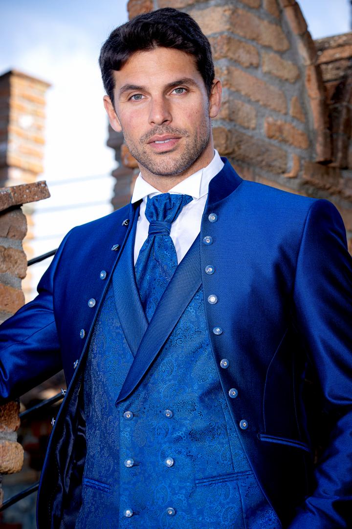 Abiti per lo sposo più esigente. Colori che vanno dal blu scuro al blu chiaro attraversando sfumature uniche nel loro genere. Abiti sposo impreziositi da finiture sartoriali e bottoni gioiello Swarovski. I revere possono essere a lancia oppure il collo della giacca può essere a scialle ma con un contrasto sul colore di base.
