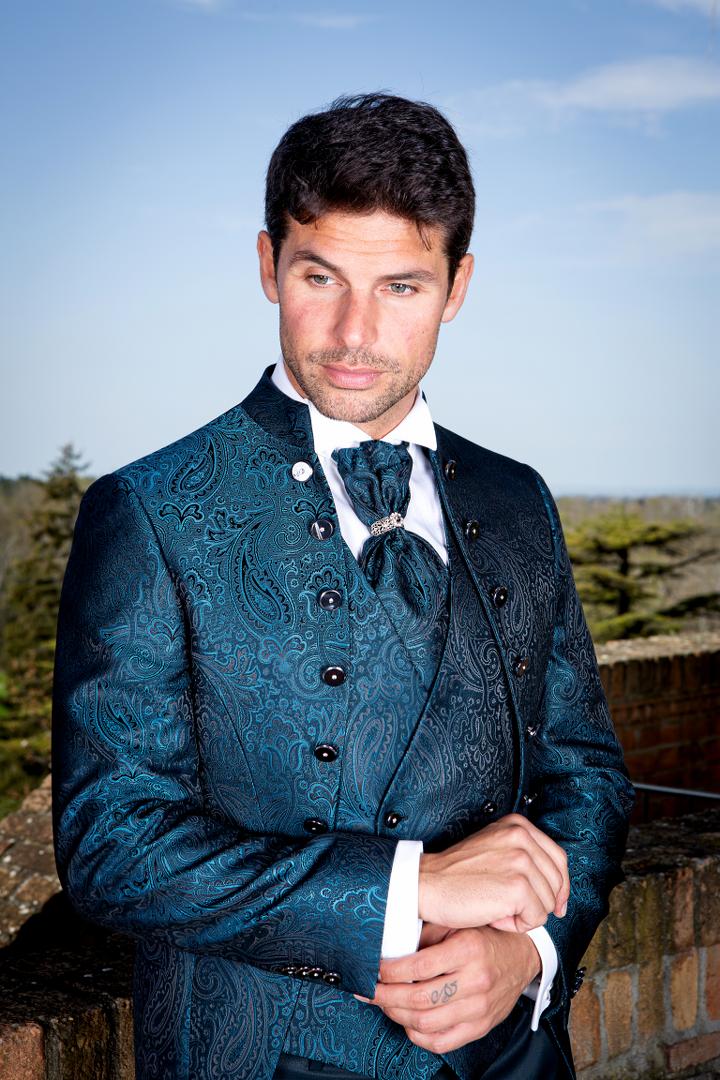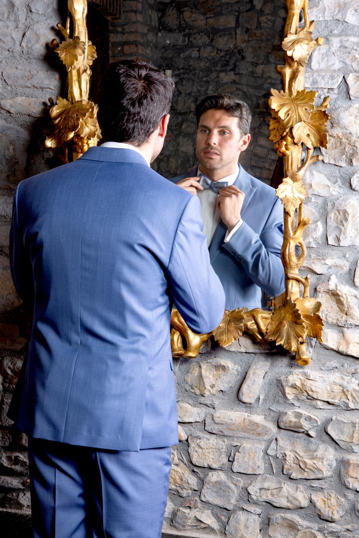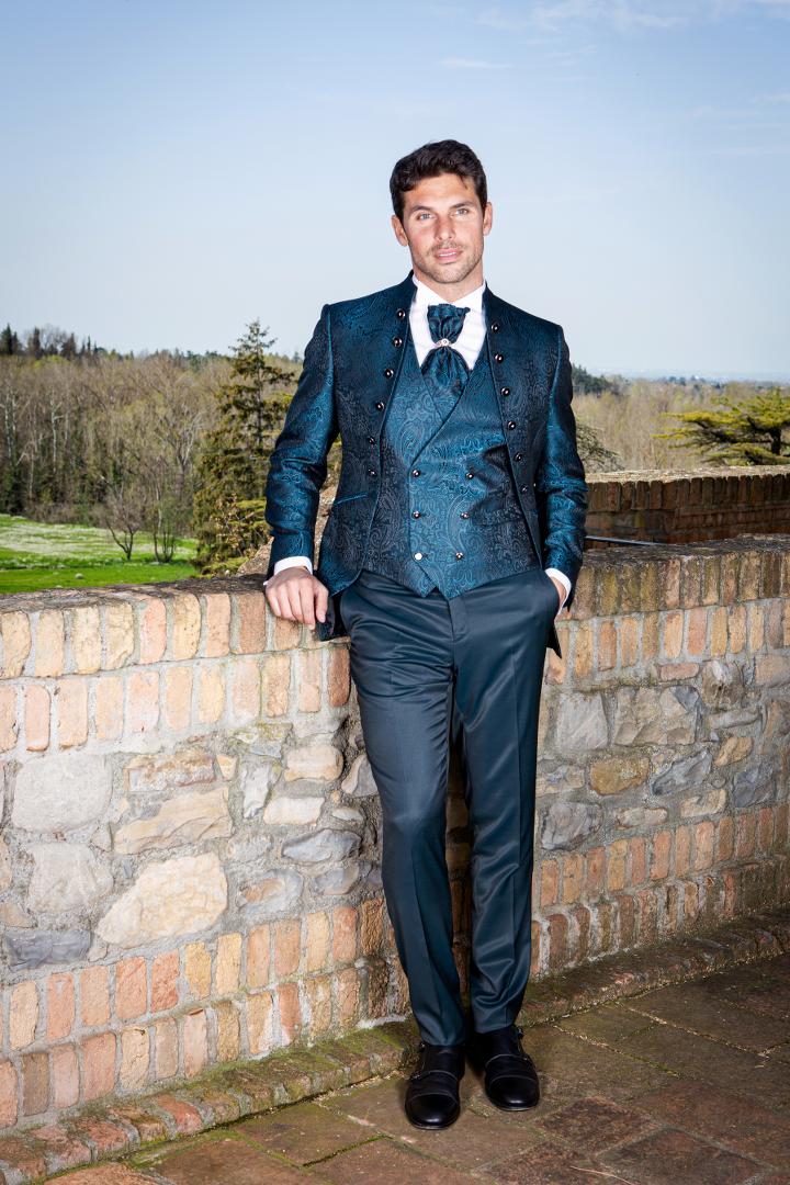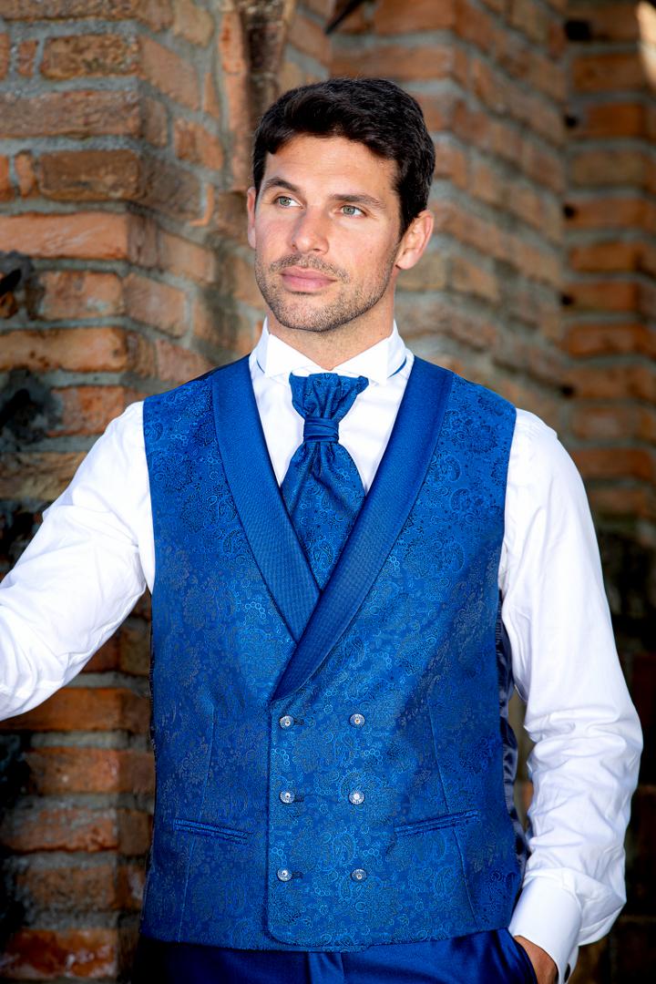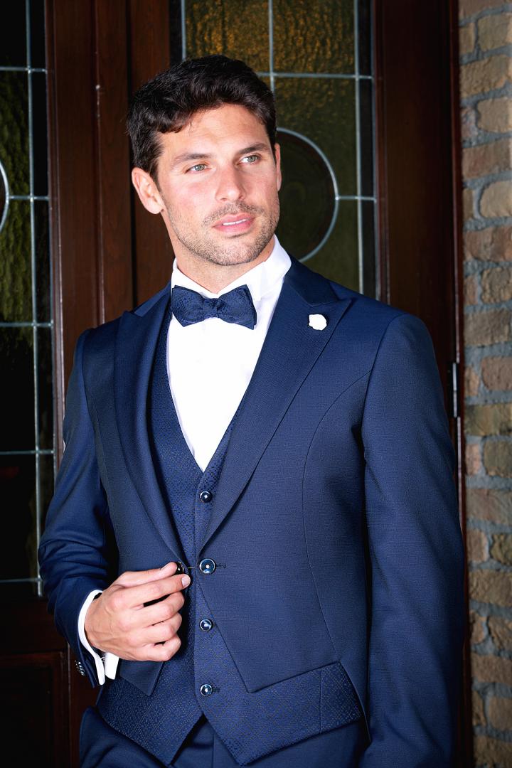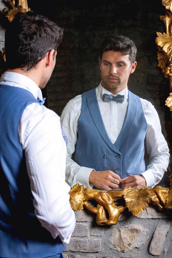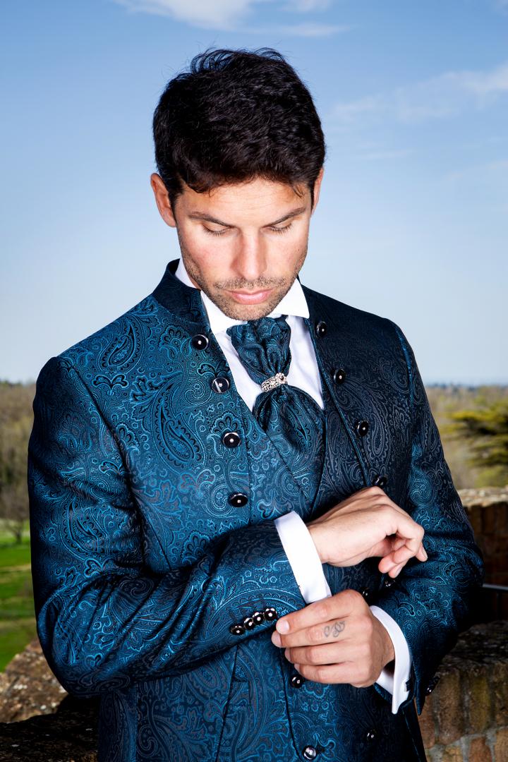 Abiti per lo sposo più esigente. Colori che vanno dal blu scuro al blu chiaro attraversando sfumature uniche nel loro genere. Abiti sposo impreziositi da finiture sartoriali e bottoni gioiello Swarovski. I revere possono essere a lancia oppure il collo della giacca può essere a scialle ma con un contrasto sul colore di base.