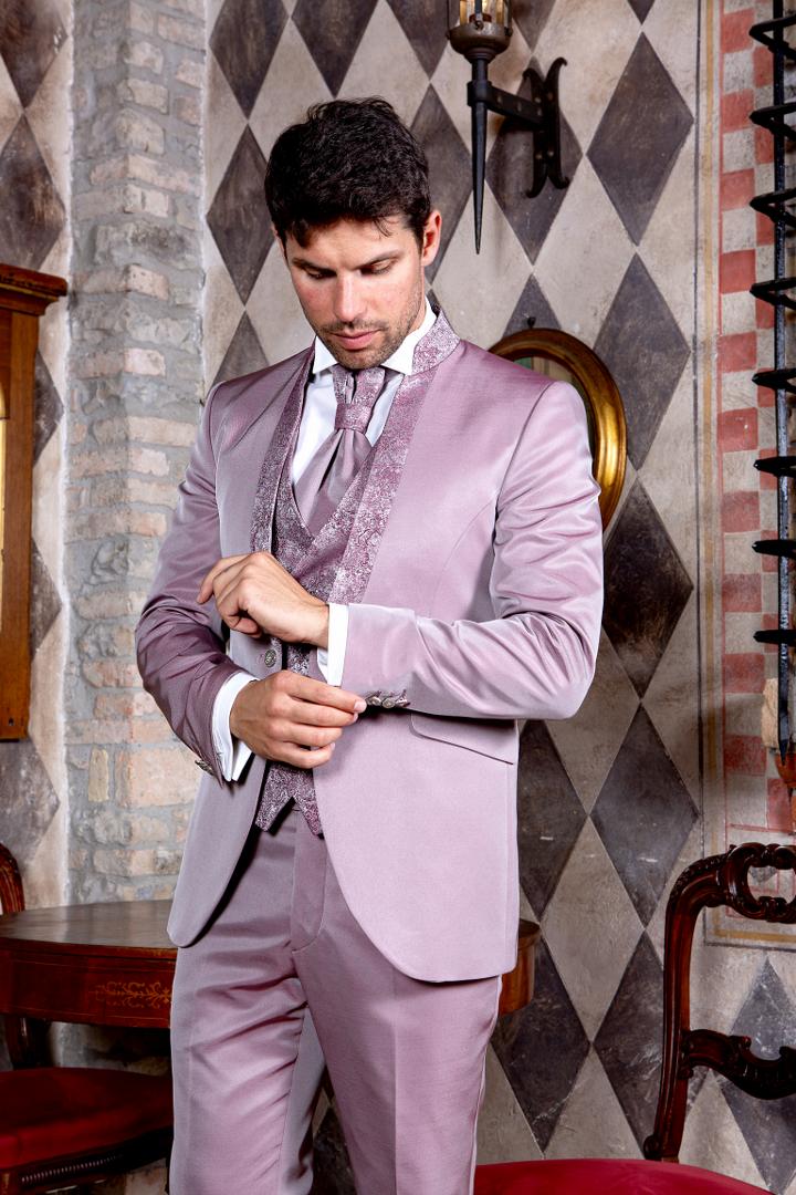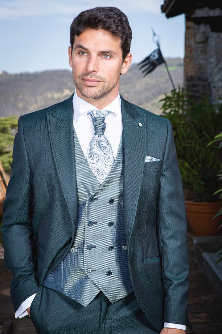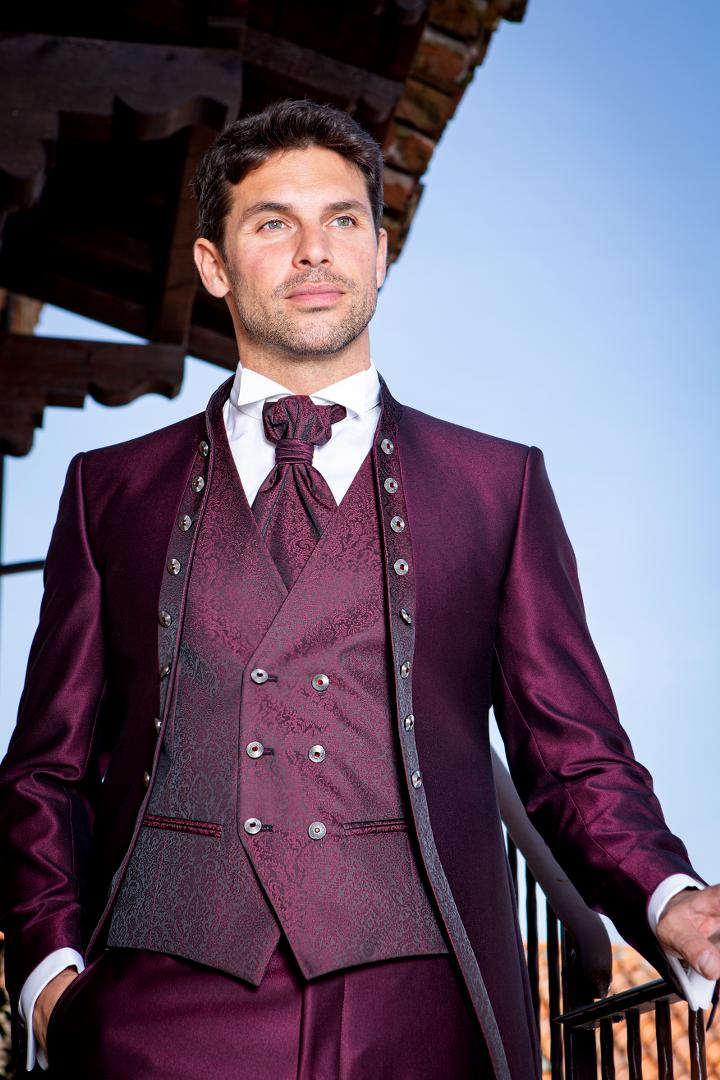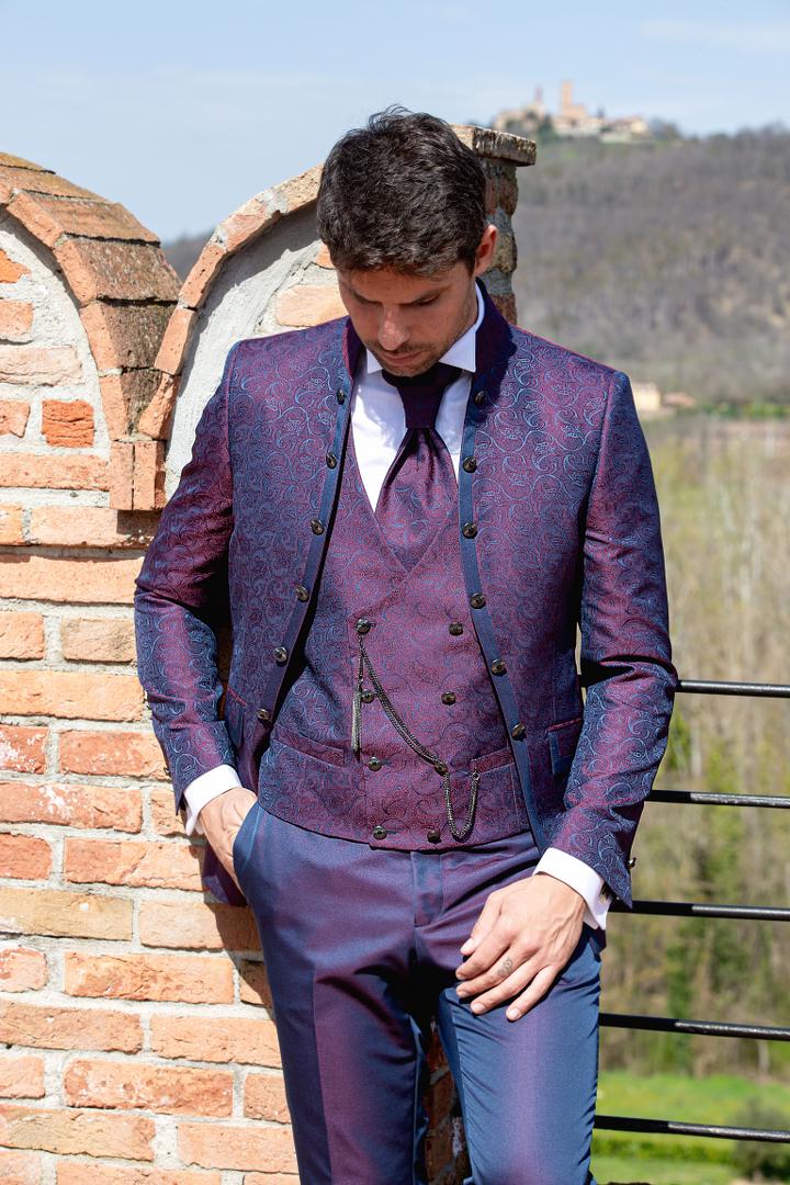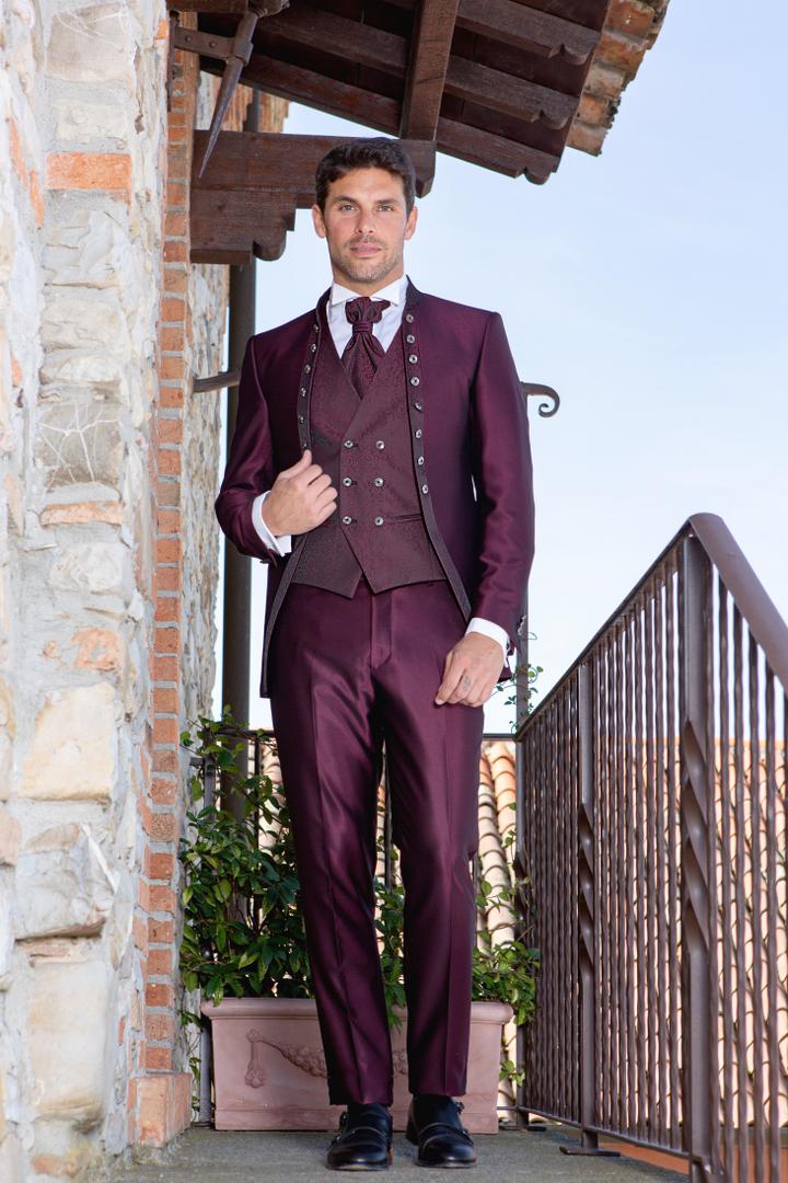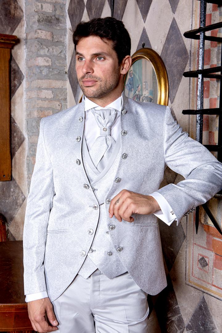 Le giacche possono anche avere il taglio alla “coreana” che ne caratterizza l’immagine cerimonia dando nel contempo uno stile innovativo allo sposo. I tessuti possono essere lucidi, semilucidi o damascato, oppure in pura lana di Tasmania con colori brillanti e gilet grigi a contrasto. Completano il quadro i cravattoni, le cravatte e tutti gli altri accessori da collo come papillon e fiocchi annodati.