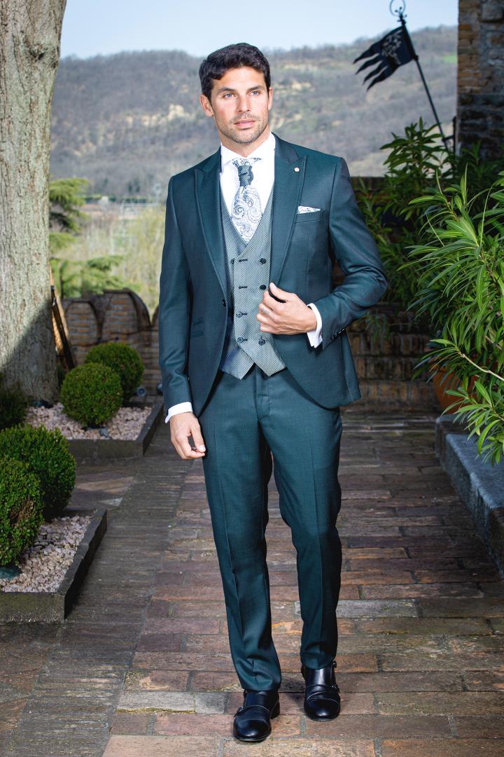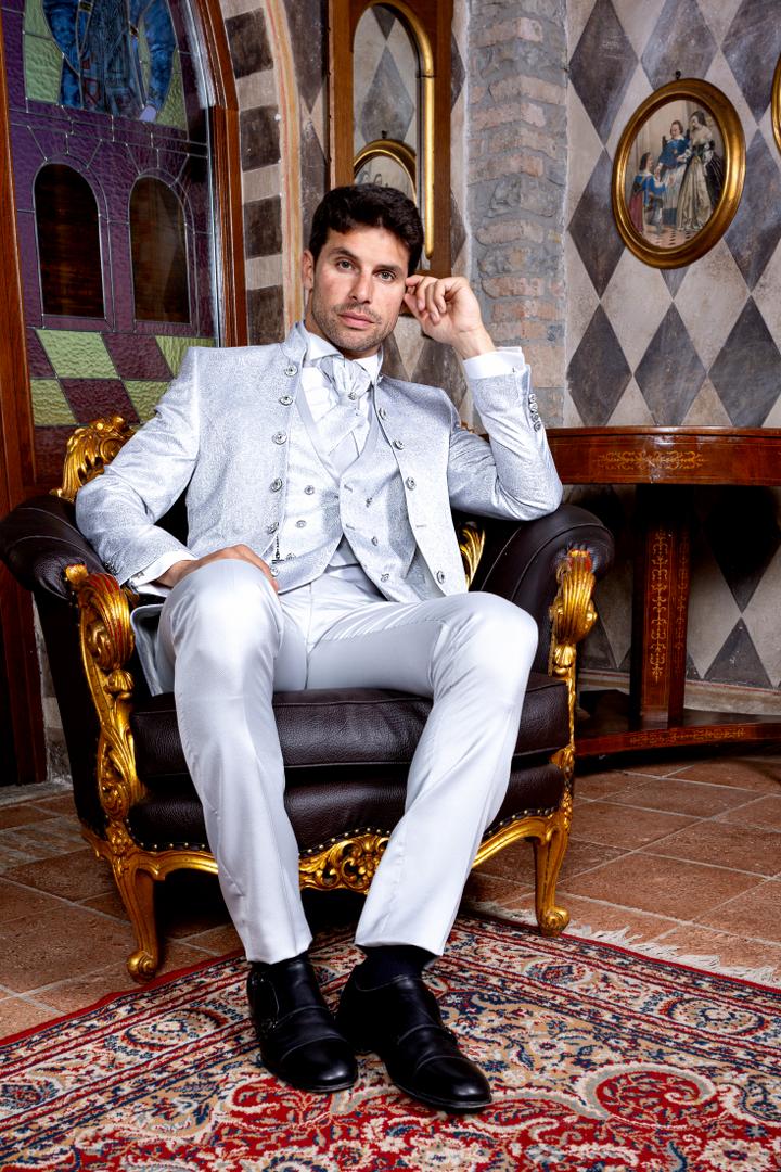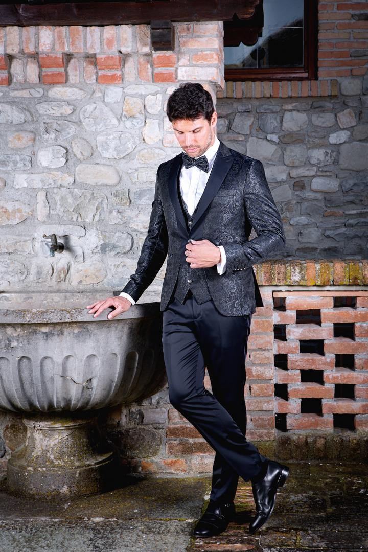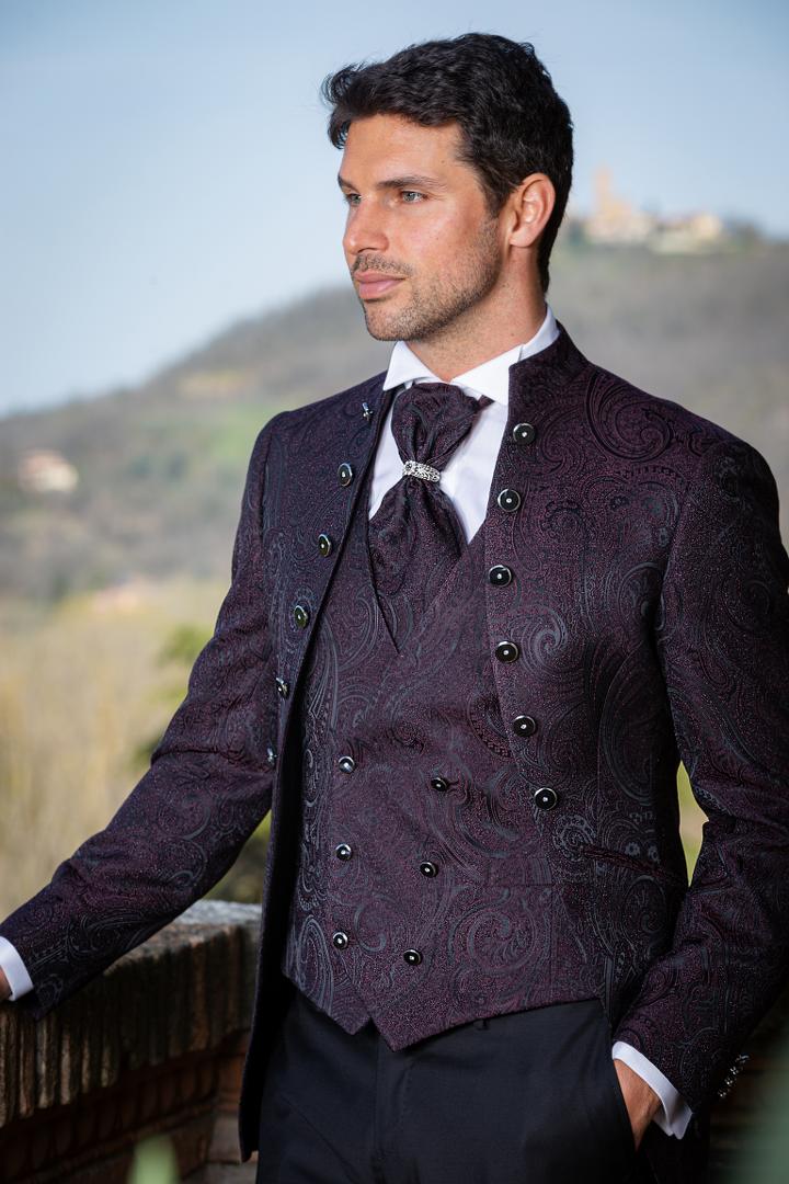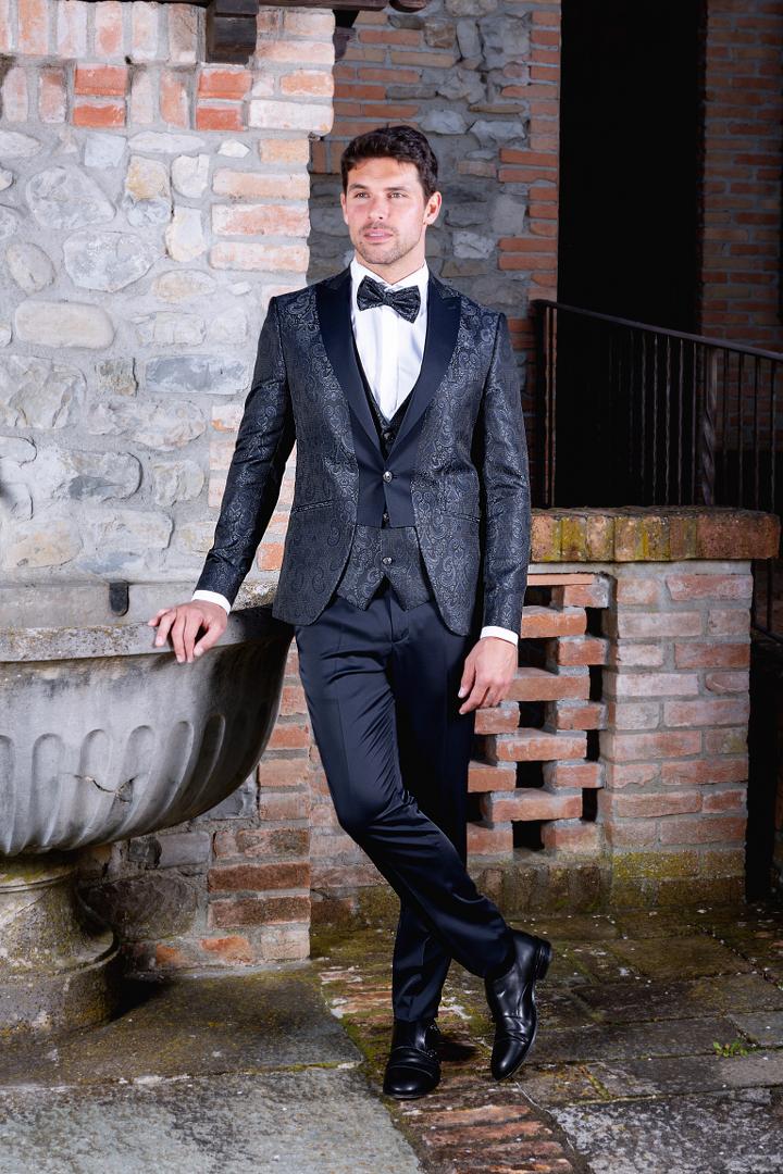 Le giacche possono anche avere il taglio alla “coreana” che ne caratterizza l’immagine cerimonia dando nel contempo uno stile innovativo allo sposo. I tessuti possono essere lucidi, semilucidi o damascato, oppure in pura lana di Tasmania con colori brillanti e gilet grigi a contrasto. Completano il quadro i cravattoni, le cravatte e tutti gli altri accessori da collo come papillon e fiocchi annodati.
